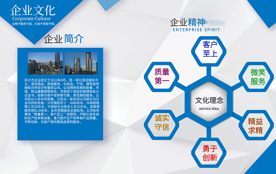 公司于2012年8月成立,致力于將9年的線下管理經驗進行線上整合,復制推廣,力爭打造一個全國性的家庭服務平臺,并基于家庭服務的大數據,融合人工智能,整合服務資源,為家庭提供全方位,多保障的管家式服務,目前風之杰已與全國百余家企業(yè)簽署戰(zhàn)略合作,通過全體員工堅持不懈的努力,逐步布局全國,完善服務,提高品質,一切努力,只為盡我所能,凈你所想。